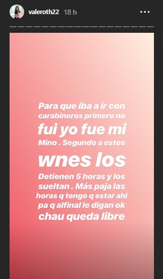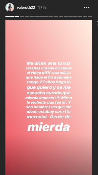 En las historias de Instagram que fue publicando del incidente, Roth asume que estaba "curada" y también mandó un mensaje a quienes justificaron la violencia del taxista por su estado. "Ahí está el video. Si yo estaba curada ok, lo asumo (...) Dejen de decir que porque estaba curada me merezco eso. ¿Qué nivel de mierda tienen en la cabeza?", se descarga la joven.