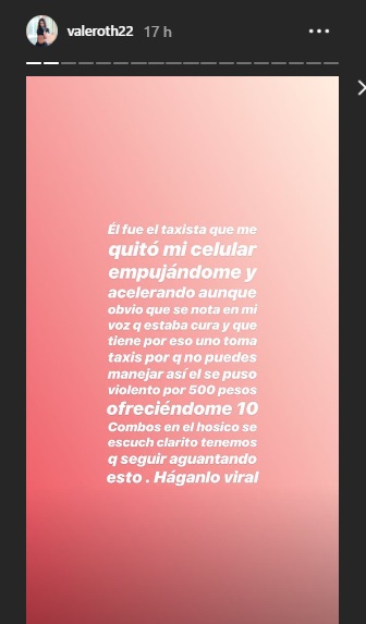 La ex Calle 7 en su Instagram denunció la actitud del taxista que la llevó a su casa después de una noche de fiesta. Roth contó que el viaje valía 3 mil pesos, pero ella sólo tenía 2 mil quinientos y fue esa falta de dinero que el taxista reaccionó violentamente contra ella.