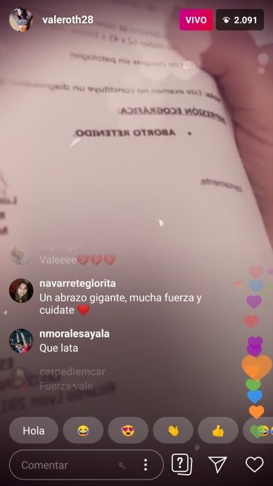 La noticia impactó de gran manera a Valentina que, a través de la transmisión mostró las ecografías y el diagnóstico que le dieron: aborto retenido. Esto significa que el embrión o feto muere en el primer trimestre, pero se mantiene más tiempo en el cuerpo de la madre, sin vida.