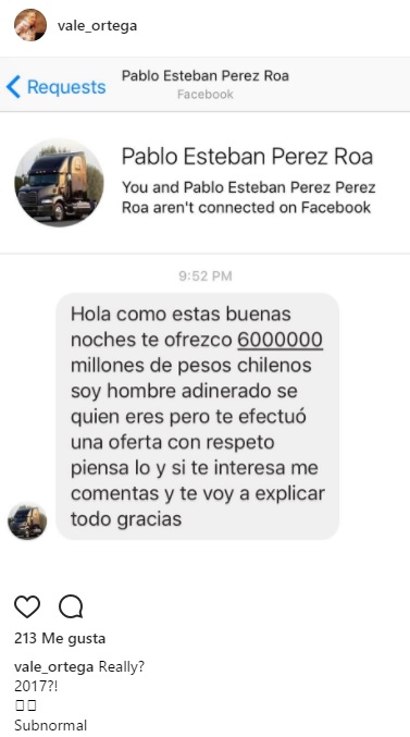 La conductora de Rock&Pop utilizó su cuenta de Instagram para funar a un usuario identificado como Pablo Esteban Pérez Roa, quien le envió el siguiente ofrecimiento. "Hola ¿cómo estás?, buenas noches, te ofrezco 6 millones de pesos chilenos. Soy hombre adinerado. Sé quién eres pero te efectúo una oferta con respeto. Piénsalo y si te interesa me comentas y te voy a explicar todo. Gracias", se podía leer en el pantallazo del mensaje que publicó la rubia en la red social de fotos. "Really? ¡2017! Subnormal", escribió ella.