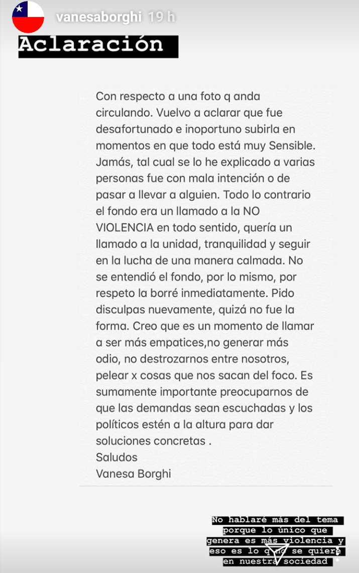 'Jamás, tal cual se lo he explicado a varias personas, fue con mala intención o de pasar a llevar a alguien. Todo lo contrario. El fondo era un llamado a la no violencia' en todo sentido', se lee en su aclaración.