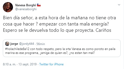 'Hola Chile. Con todo respeto, pero la srta Vanesa es como poroto en paila marina es ese programa. ¿Amiga de quién es?', escribió un usuario de Twitter, a lo que Vanesa respondió: