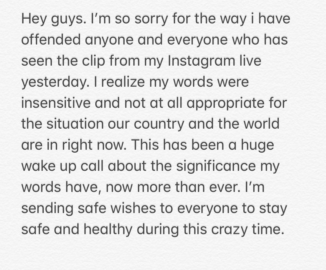 "Hola chicos. Lamento la forma en que he ofendido a cualquiera y a todos los que han visto el clip de mi Instagram Live ayer. Me doy cuenta de que mis palabras eran insensibles y nada apropiadas para la situación en la que se encuentran nuestro país y el mundo en este momento. Esta ha sido una gran llamada de atención sobre la importancia que tienen mis palabras, ahora más que nunca. Estoy enviando mis mejores deseos a todos para mantenerse seguros y saludables durante este tiempo", expresó Hudgnes en sus redes sociales.