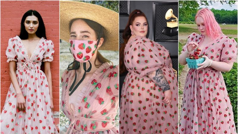Un vestido de tul rosa pastel con fresas bordadas ha sido una sensación en redes sociales, especialmente entre las generaciones jóvenes. El vestido diseñado por Lirika Matoshi ha estado en venta desde 2019 y tuvo su paso por Hollywood, pero recién en la pandemia este vestido ha sido tendencia en los feed de Instagram.