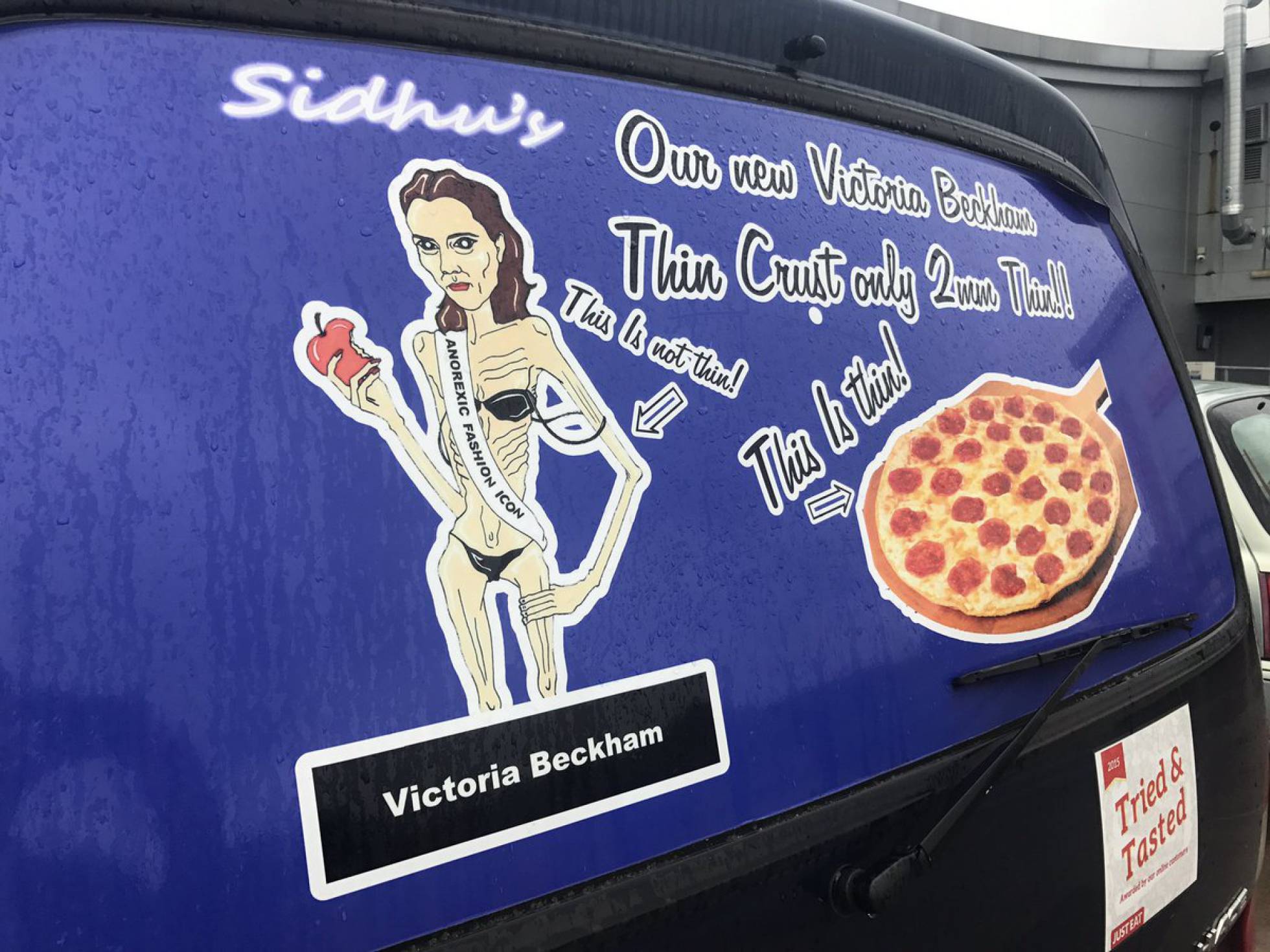 La ilustración aparece en todos los vehículos que hacen las entregas a domicilio con el anuncio de que “nuestra nueva pizza delgada Victoria Beckham tiene solamente dos milímetros de espesor”.