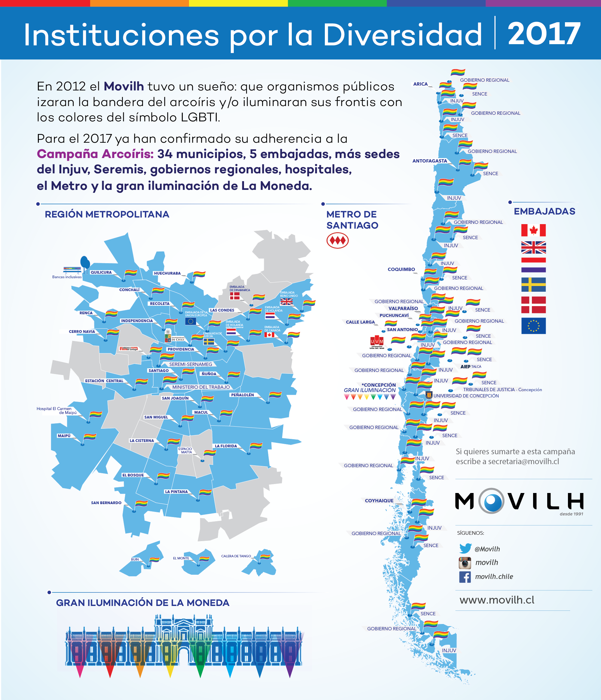 Además de la iniciativa del Metro, otras instituciones se sumaron al llamado de izar banderas del arcoíris o iluminar sus fachadas con sus colores. Así 34 municipalidades, 5 embajadas, sedes del Injuv, Seremis, gobiernos regionales y hospitales han participado durante de día, que culminará con la iluminación de La Moneda a las 19 horas.