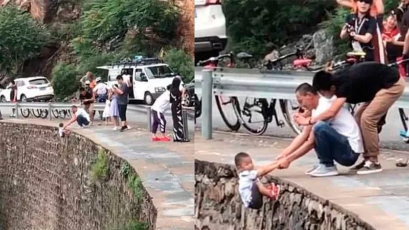 Se trata de un video captado por un testigo que estaba en el lugar, donde se ve a un padre sosteniendo a su hijo de las manos a varios metros de altura. Esta riesgosa situación fue sólo por una foto, lo que enojó a millones de personas tras viralizarse la noticia.