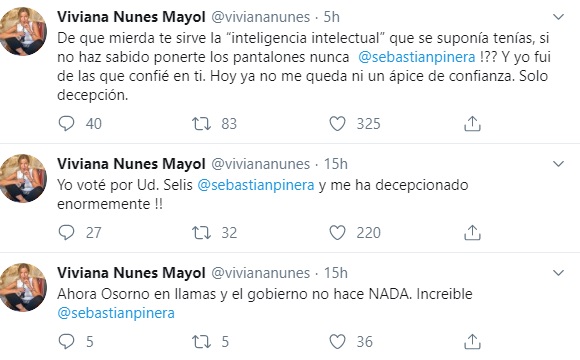 Nunes hizo un fuerte descargo sobre la situación actual del país, increpando directamente al mandatario. En su primer tuit escribió: "Renuncia pronto, Piñera cagón. No tenemos Presidente con autoridad… ¿Por qué no le ofreces soluciones reales a la gente?".
