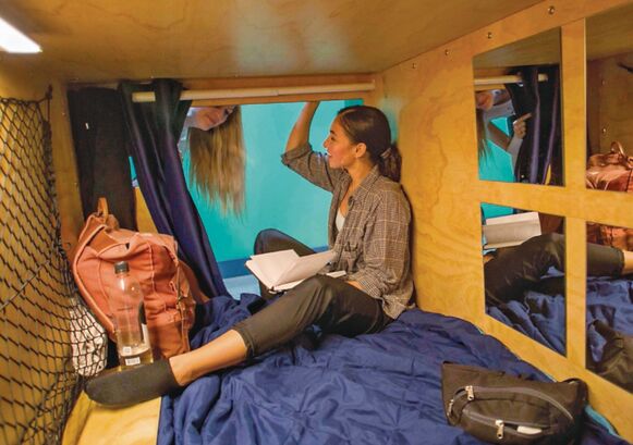 Según señala, en una habitación puede haber hasta 6 "cajas-dormitorio", cuya media es de 1,22 x 2,44 m. En su interior, tienen una cama individual, una rejilla para el aire, una barra al fondo para colgar ropa y algunos comportamientos para guardar zapatos y otras prendas.