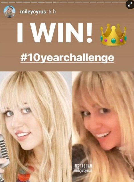 Una de las postales que más llamó atención fue la que hizo aludiendo al "#10yearchallenge", donde comparó una foto de la Hannah original a una de Miley con la peluca hoy en día.