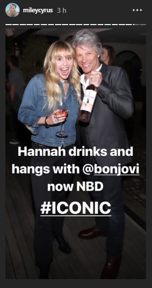 Por último, Miley salió con la peluca de Hannah a un evento, donde consiguió una foto junto a Jon Bon Jovi, donde escribió: "Hannah ahora toma vino".