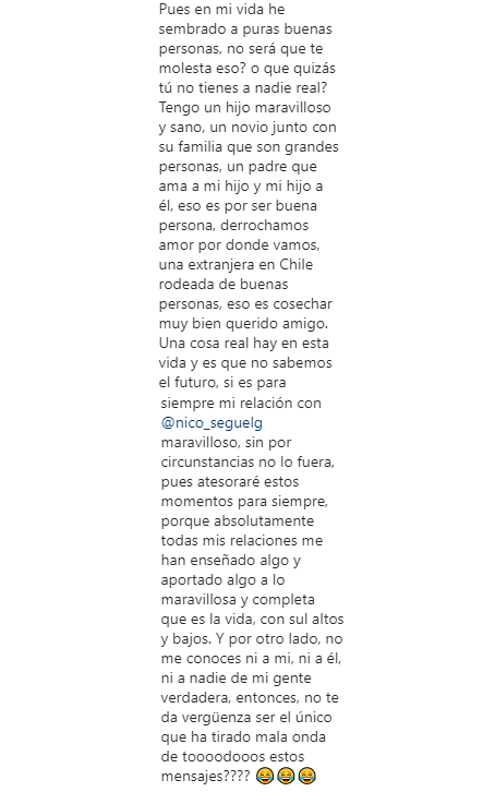 Frente a esto, la española redactó una larga respuesta. "Pues en mi vida he sembrado a puras buenas personas, no será que te molesta eso? o que quizás tú no tienes a nadie real? Tengo un hijo maravilloso y sano, un novio junto con su familia que son grandes personas, un padre que ama a mi hijo y mi hijo a él", dijo.