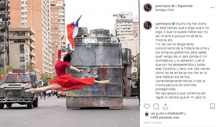 'Mucho me han dicho en este tiempo, que si digo, que si no digo, o que no puedo hablar por no ser chilena o porque no sé de su historia, etc. Y sí, tal vez no tenga tanto conocimiento de la historia de Chile y sus antiguos gobiernos, pero ¿sabes qué? Vengo de un país donde sí viví la dictadura y la represión. Y sé lo que son los desaparecidos y todas esas injusticia, y llevo una vida viendo cómo los de arriba se nos ríen en la cara hasta el día de hoy'.