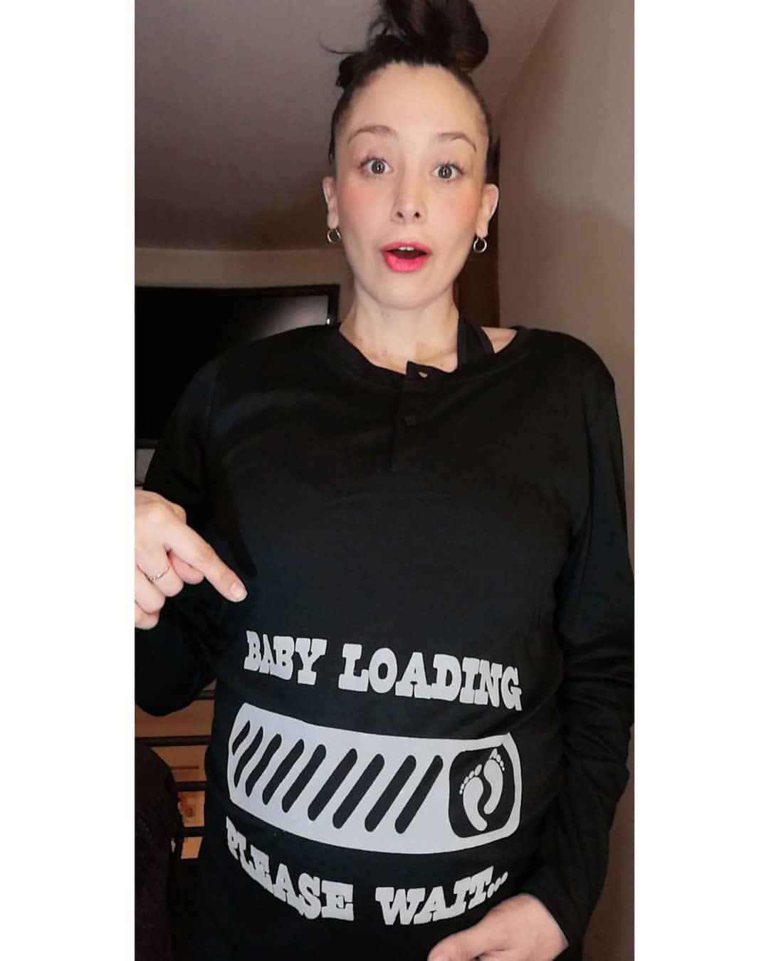 El atuendo es negro, pero tiene justo en la pancita una gráfica de una batería cargándose y la frase: "Baby Loading. Please wait.." ('Bebé cargando. Por favor espere').