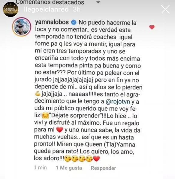 Y luego agregó que 'ya no depende de mí, así que ellos se lo pierden, naaa... Es tanto el agradecimiento que le tengo a Rojo y a ustedes, mi público querido, que me voy feliz', agregó Yamna, sin duda, una de las más figuras más queridas tras el regreso de 'Rojo'.