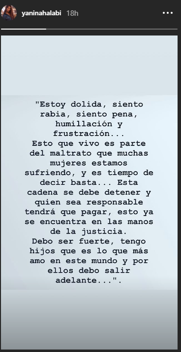 En su Instagram, ella escribió: “Estoy dolida, siento rabia, siento pena, humillación y frustración. Esto que vivo es parte del maltrato que muchas mujeres estamos sufriendo y es tiempo de decir basta. Esta cadena se debe detener y quien sea responsable tendrá que pagar. Debo ser fuerte, tengo hijos que es lo que más amo en este mundo y por ellos debo salir adelante".