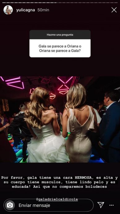 Esto luego de que a la trasandina le preguntaran en su Instagram: «¿Gala se parece a Oriana o Oriana se parece a Gala?». Yuli no dudó en responder y sin filtro, defendió a su amiga.