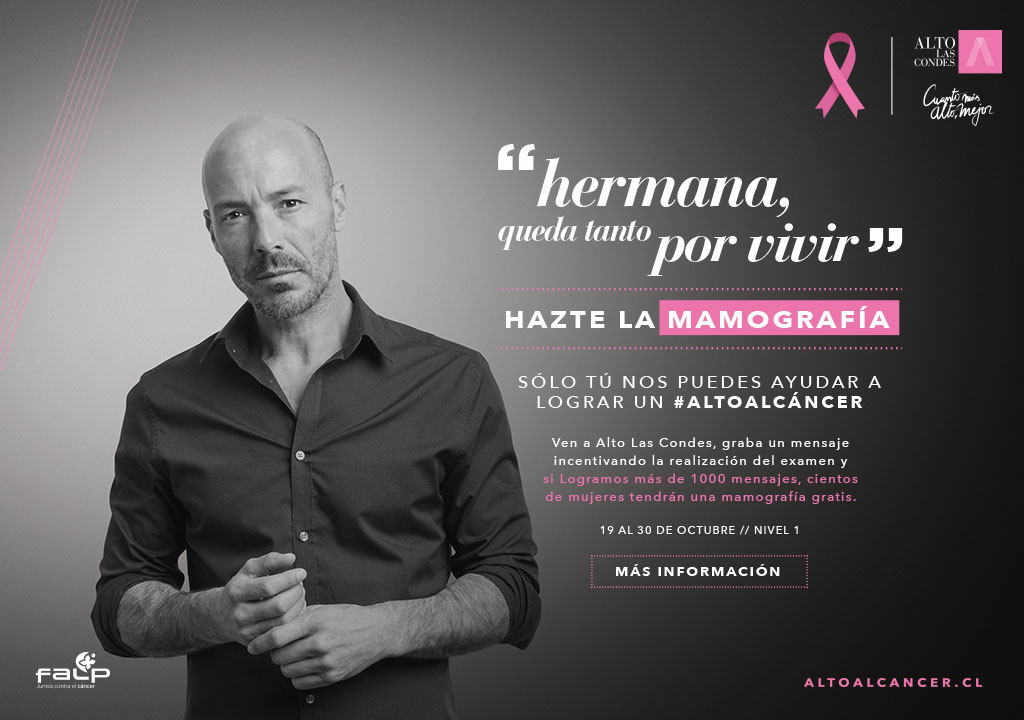 Por eso, con motivo de la conmemoración del Día mundial contra el cáncer de mama, hoy 19 de octubre, Fundación Arturo López Pérez y Alto Las Condes lanzaron la campaña Alto al cáncer, la que busca incentivar la concientización de la ciudadanía en la prevención y la implicancia de tener cáncer de mama.