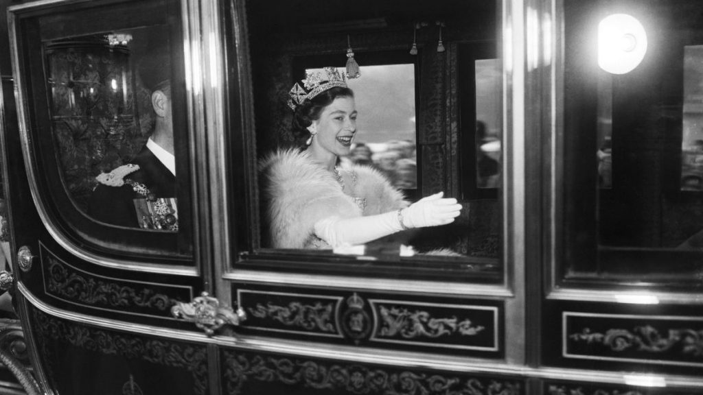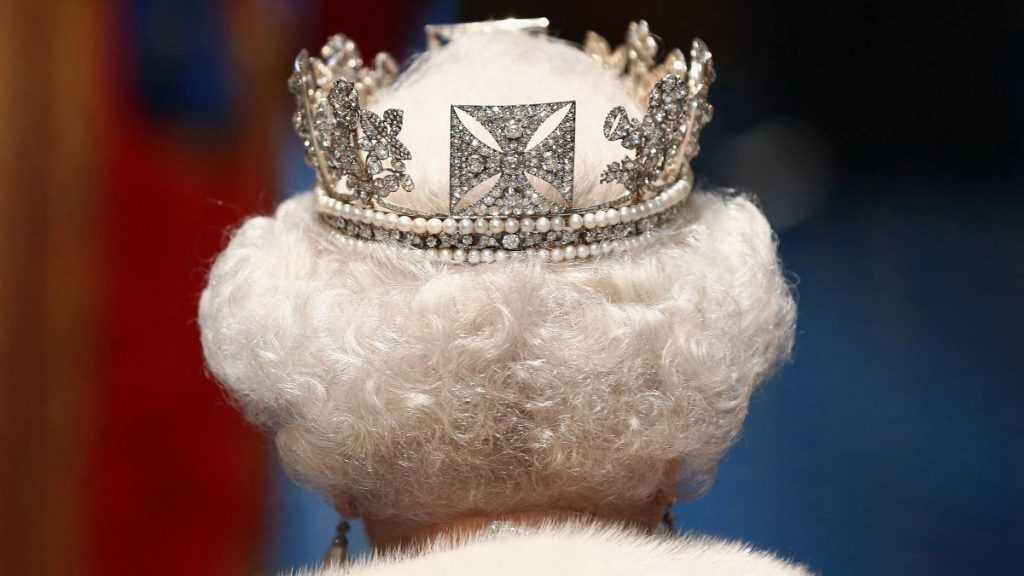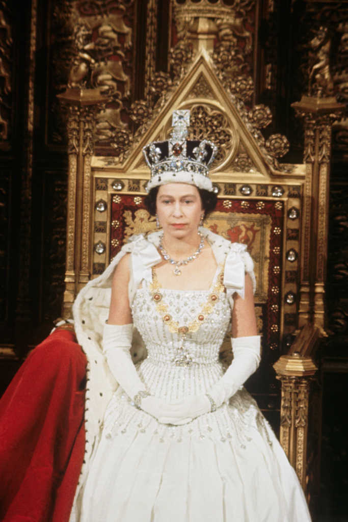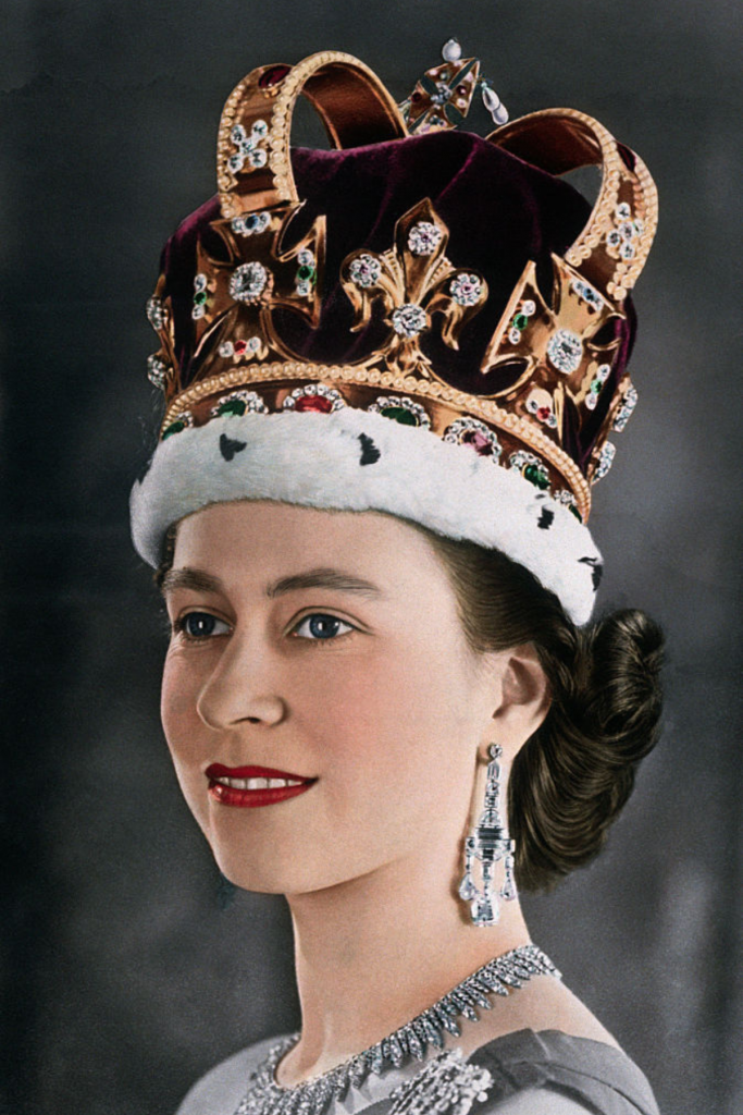 La reina Isabel II utilizó tres coronas para el día de la coronación. La monarca inició la ceremonia con la diadema de estado de Jorge IV que usó desde el Palacio de Buckingham hasta la abadía de Westminster, que cuenta con 1.333 diamantes, 169 perlas y cuenta con tres flores del Reino Unido.
