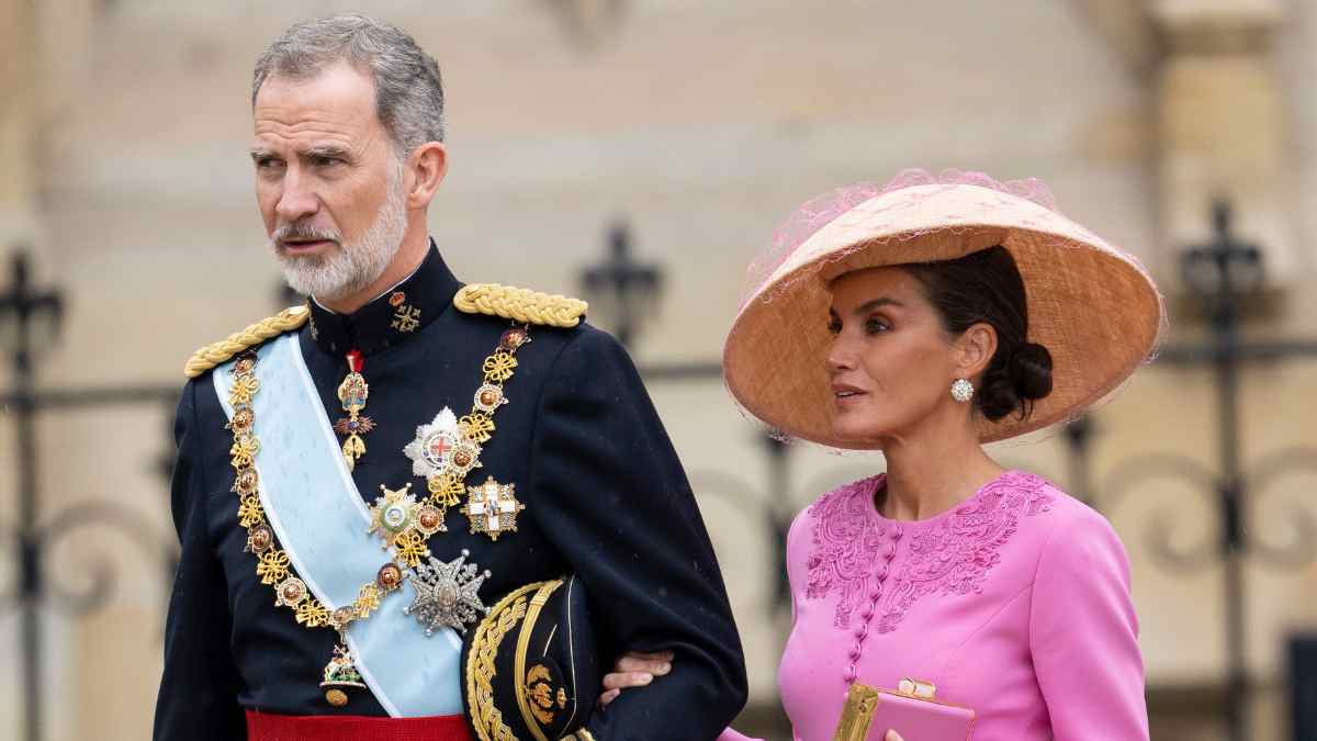 Otras figuras reconocidas que llegaron fueron los reyes Felipe y Letizia Ortiz, ella usó un traje de dos piezas completamente rosado. Y él su uniforme.
