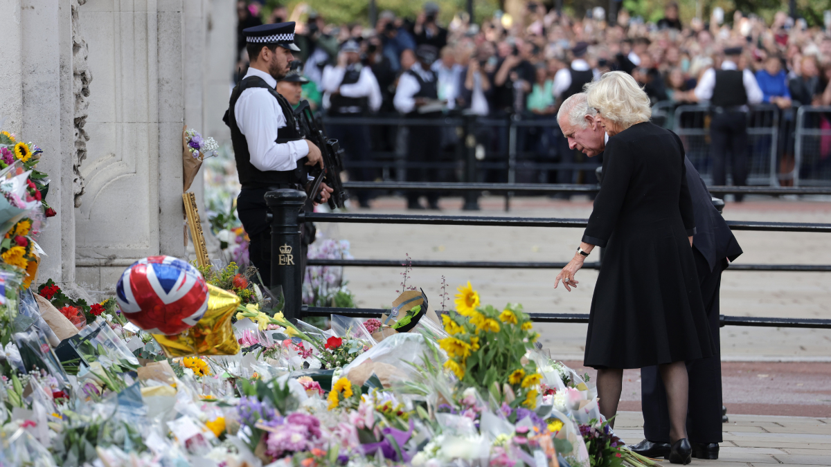 Luego de este acercamiento a los seguidores de la monarquía, el Rey Carlos III caminó hacia el Palacio de Buckingham junto a la Reina Consorte, Camilla Parker, quien no acudió al saludo de las personas. Sino que se quedó observando los miles de ramos de flores que estaban apostados en las inmediaciones del lugar.