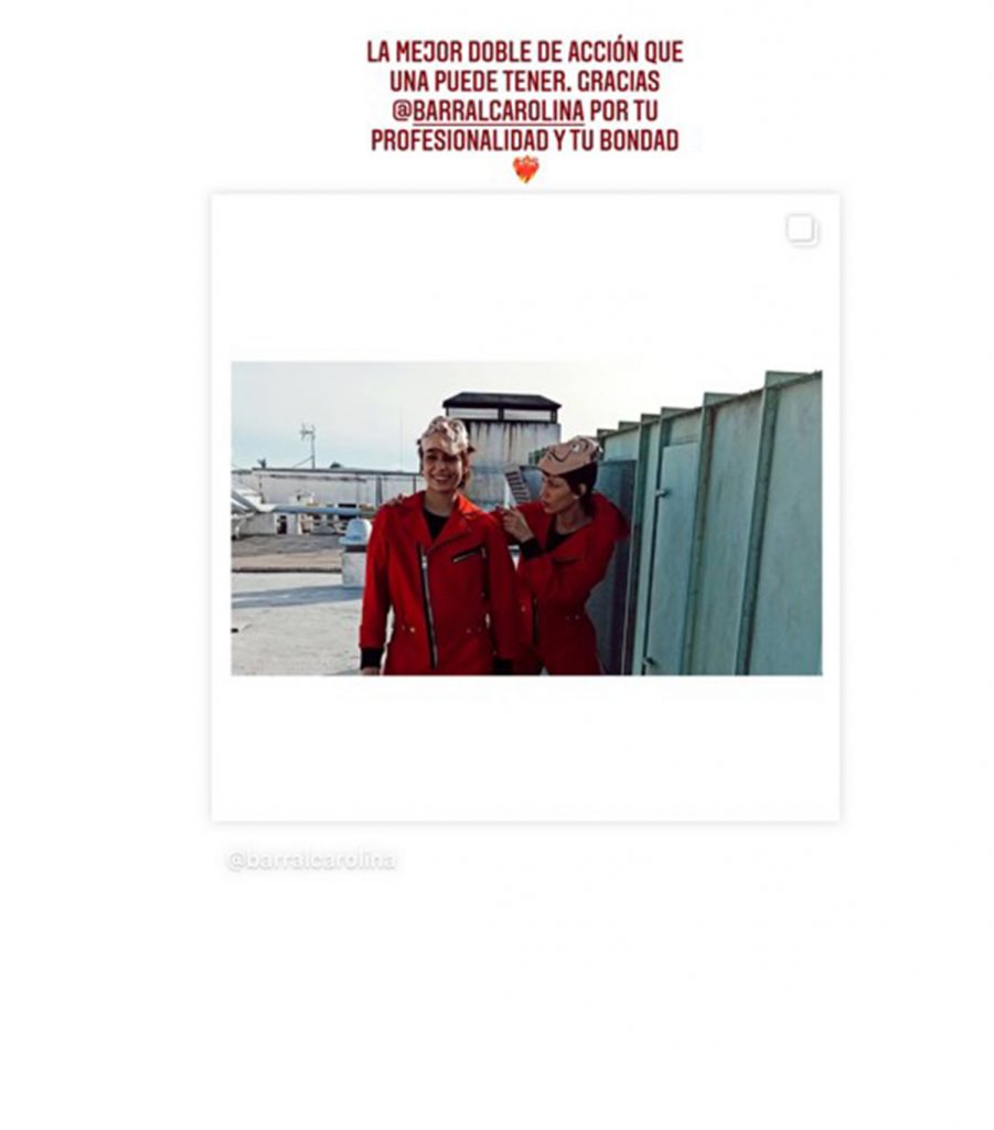 "La mejor doble de acción que pude tener. Gracias @barralcarolina por tu profesionalidad y tu bondad", escribió la actriz que interpreta a Tokio en La Casa de Papel.