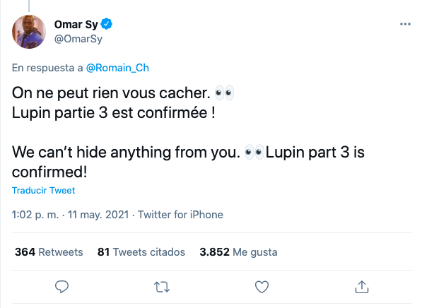 A través de su cuenta oficial de Twitter donde Omar Sy ha querido compartir la noticia de que 'Lupin' tendrá tercera temporada: "No podemos ocultarte nada. La parte 3 de 'Lupin' está confirmada", escribió.