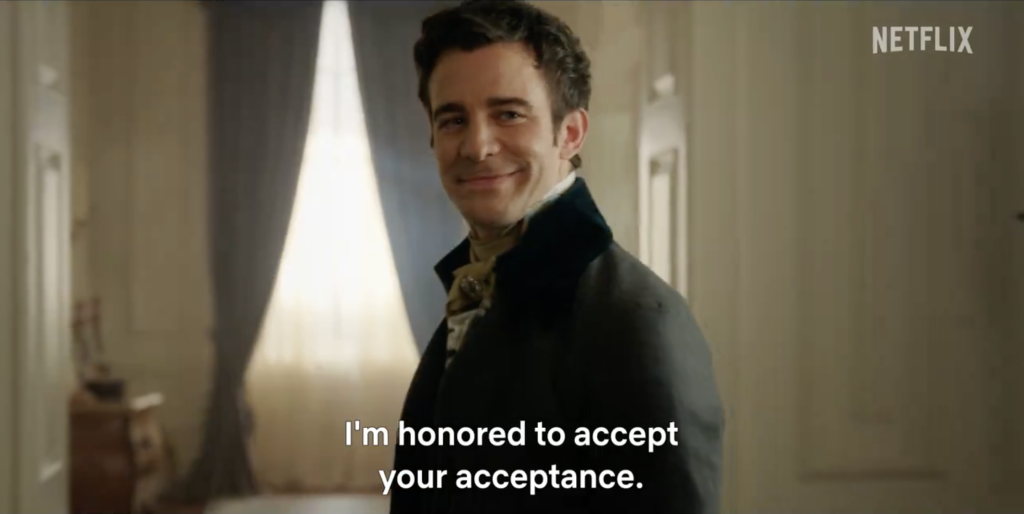 "Me siento honrado de aceptar su aceptación", dice el querido personaje que tanto ha enamorado en las historias de los libros y películas, escritas por Julia Quinn.