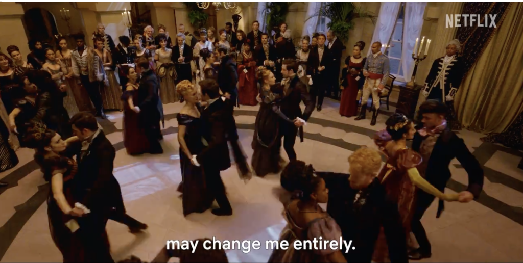 El tercer libro de la saga nos entrega una historia de amor entre Benedict y una chica que no pertenece a una familia adinerada. Ambos se conocen en el baile de máscaras de Violet Bridgerton (Ruth Gemmell) y comparten tiempo juntos. No obstante, esto no dura mucho y ella vuelve a su vida real como sirvienta.