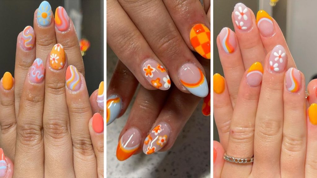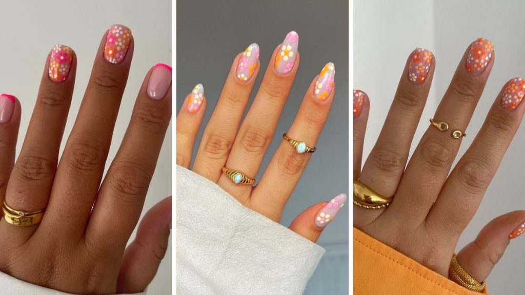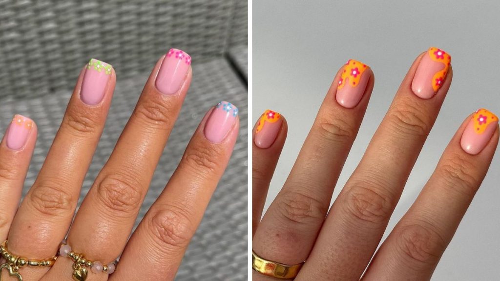Si te gusta aventurarte y mezclar diseños este es tu diseño perfecto. Las flores son las protagonistas pero puedes unirlas con ondas y círculos coloridos que le darán un toque diferente a tu manicura, además tendrás las uñas más originales.