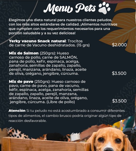 Este lugar cuenta con varias sucursales en Santiago y una en Pichilemu. Uno de los más recomendados es el local de Providencia, en General Flores 229. En su menú pets, destacan platos como un mex de salmón con kefir, espinaca, acelga, zanahoria, manzana, perejil, arándano, linaza y cúrcuma. También, ofrecen un mix de pavo con los mismos ingredientes. Además hay un plato hecho a base de trocitos de carne de vacuno deshidratados. Para consultar la carta completa, pulsa en este enlace.