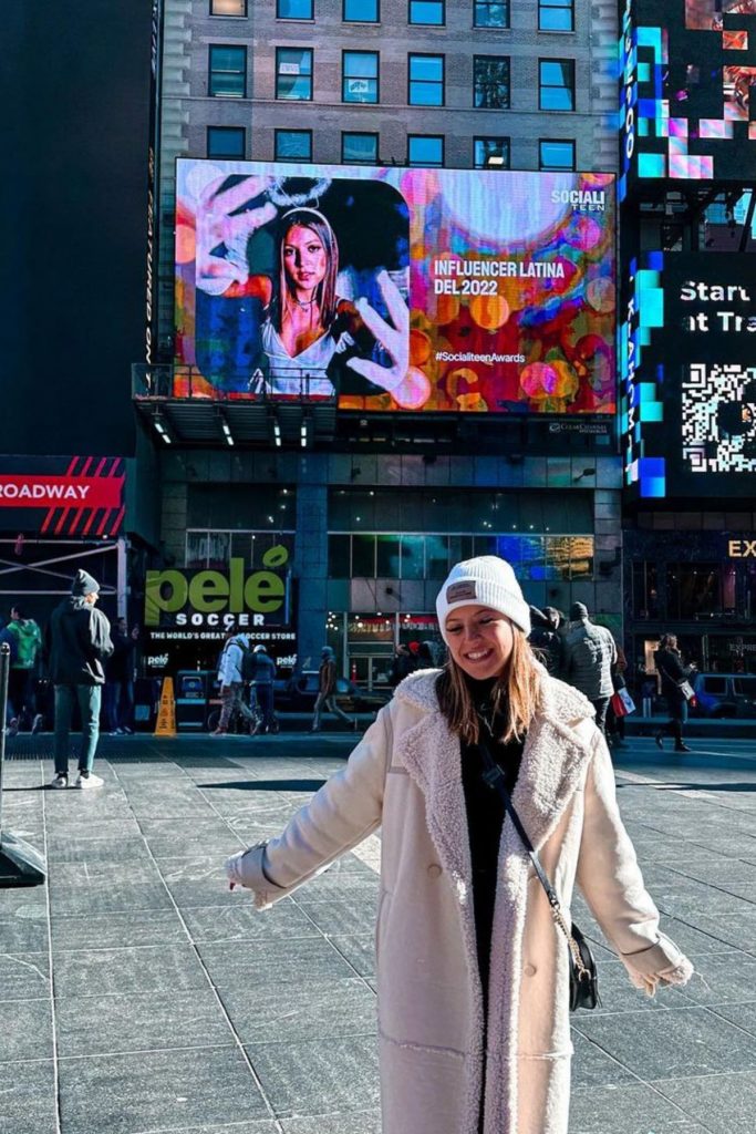 Los ganadores se dieron a conocer a través de las pantallas de Times Square, donde Ignacia Antonia fue reconocida como la Influencer Latina del Año. Y para mostrar cada detalle, se fotografió con el gran letrero que la reconocía.