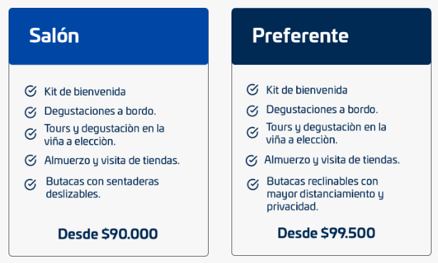 Primero que nada está el "Salón", el cual cuenta con un Kit de bienvenida, degustación a bordo del recorrido, butacas con sentaderas deslizables. Además, cuenta con el tour y degustación guiada por la viña, más el almuerzo y visitas a tiendas. El valor de este pasaje es de $90.000 hacia arriba.