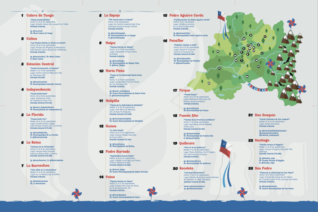 En total consta de un total de 25 puntos donde será posible encontrar gastronomía, música y juegos tradicionales de Fiestas Patrias. Así, podrás encontrar fondas, fiestas costumbristas y festivales en Santiago, San Bernardo, Ñuñoa, Padre hurtado, Quilicura, y más. Revisa el detalle a continuación.
