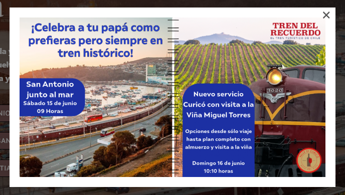 Debemos recordar que esta especial fecha para los padres se celebra el próximo domingo 16 de junio. Mismo día en el que se realizará un nuevo viaje junto al Tren del Recuerdo, el cual tiene como destino Curicó. Este paseo inicia en Santiago, y recorre un gran número de comunas y zonas preciosas para el turismo.