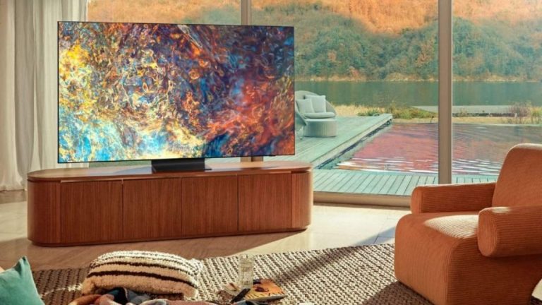 Su tecnología Quantum Mini LED permite un mayor nivel de detalles en la imagen, una pantalla sin bordes, sonido envolvente con seis parlantes distribuidos. También ofrece la posibilidad de ver cuatro contenidos a la vez y opciones para el teletrabajo para usar la TV como monitor desde el teléfono.