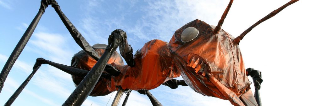 En este desfile de insectos gigantes, dos hormigas, una araña, una mantis, una planta carnívora y una libélula, invadirán el espacio cotidiano para transformarlo en un mundo fantástico.