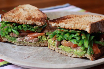Ingredientes: ½ taza de porotos verdes, 1 diente de ajo rallado, 2 tomates medianos, 4 rebanadas de pan Fuchs Natura Semillas, 800 gramos de bistec de vacuno, aceite de oliva, ají verde en rodajas cortados muy finos, Jugo de medio limón, sal y pimienta recién molida.