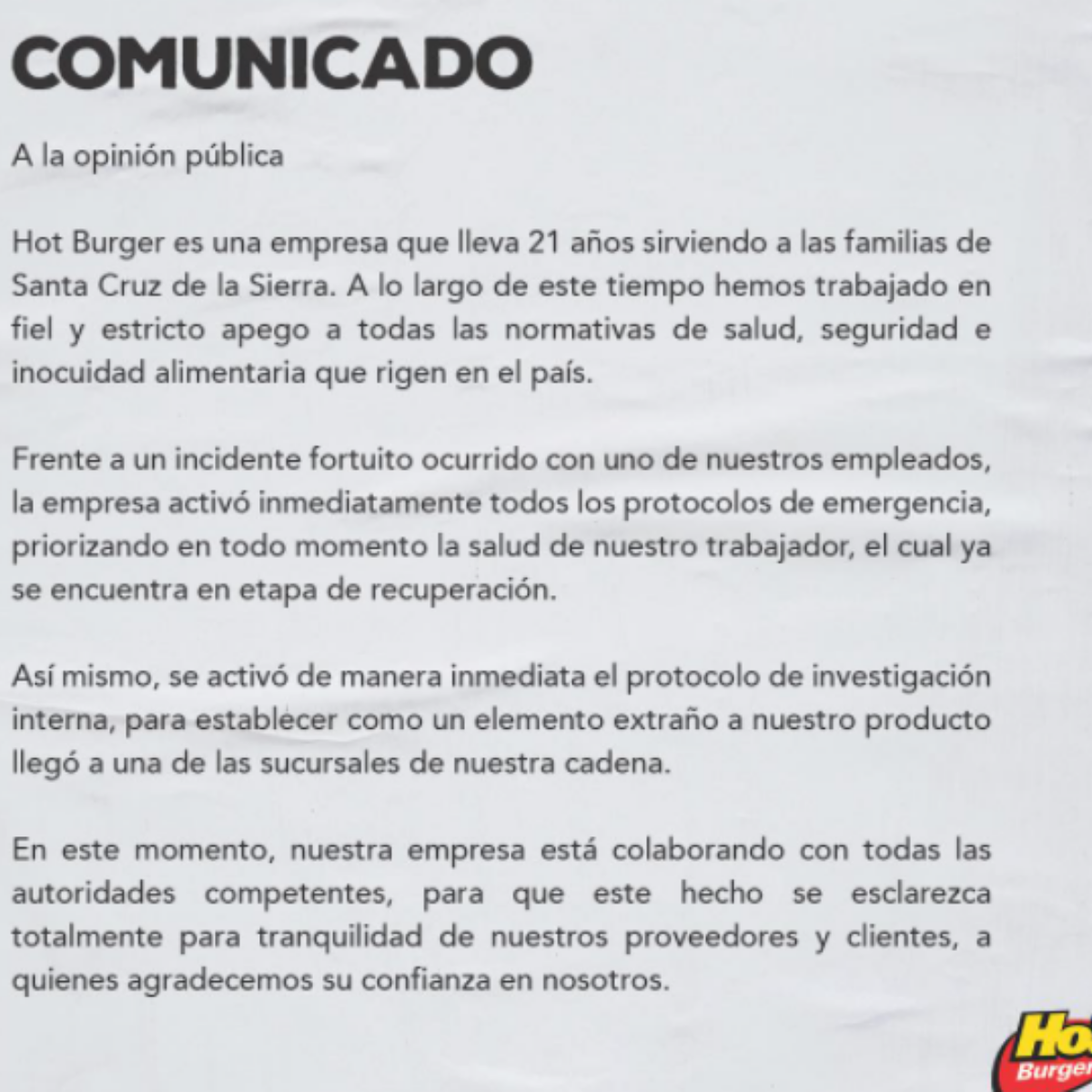 "Hot Burger lleva 21 años sirviendo a las familias", mientras que "frente al accidente fortuito, la empresa activó de manera inmediata todos los protocolos de emergencia, priorizando en todo momento la de nuestro trabajador, el cual ya se encuentra en estado de recuperación".