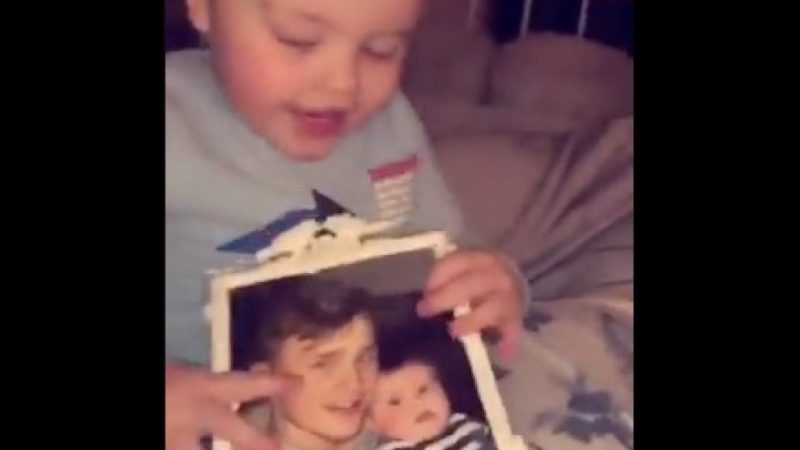 Bebé mira la foto de su padre muerto el año anterior y sonríe dónde no hay nadie a la vista.