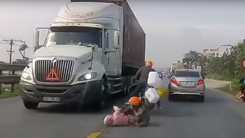 Todo se desencadenó luego de que un vehículo topara a la motocicleta en la que iba una pareja y su pequeño hijo. En cuestión de segundos, la madre y el niño caen al asfalto mientras que un gran camión se aproximaba por la pista contraria.