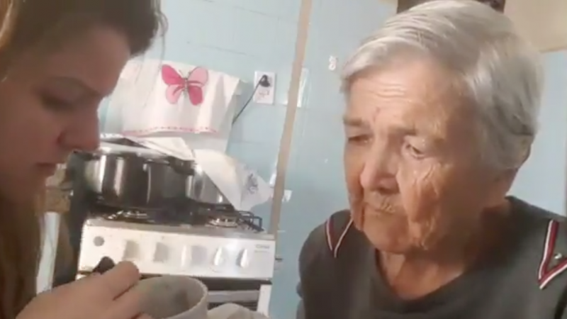 En el registro se puede ver a una mujer joven alimentado en la boca a su madre con Alzheimer. Por unos segundos la anciana se queda mirándola fijamente, lo que su hija interpreta como un momento de lucidez. “Habla, mamá”, le pide.
