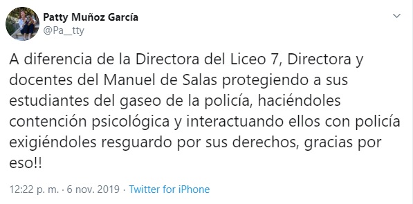 "A diferencia de la Directora del Liceo 7, Directora y docentes del Manuel de Salas protegiendo a sus estudiantes del gaseo de la policía, haciéndoles contención psicológica y interactuando ellos con policía exigiéndoles resguardo por sus derechos", escribió en Twitter la defensora de los Derechos de la Niñez, Patricia Muñoz García.